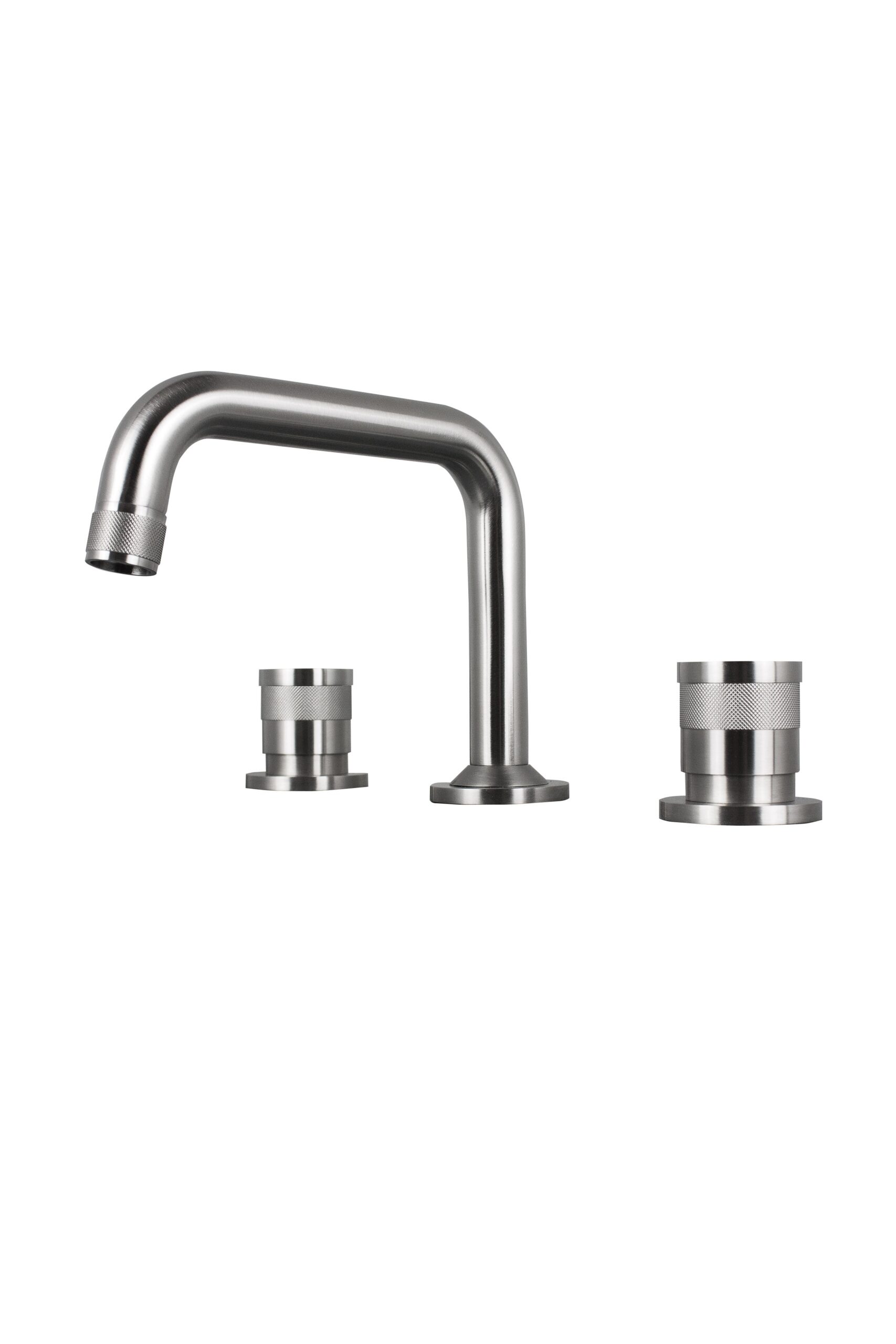3-hole 316L stainless steel basin mixer without drain, with low spout, M18, 5×1 anti-limescale aerator and 1/4 turn ceramic screw and G1/2″ connection.