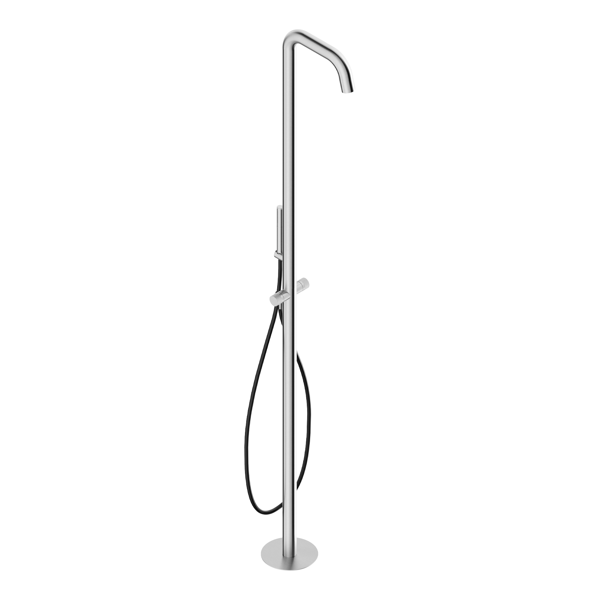 Colonna doccia da pavimento in acciaio inox 316L, con miscelatore progressivo e deviatore rotativo 2 vie, doccetta anticalcare con flessibile lunga 160 cm, manopola godronata, blocchetto ad incasso. N.B. È necessario blocchetto incasso codice T36500S.