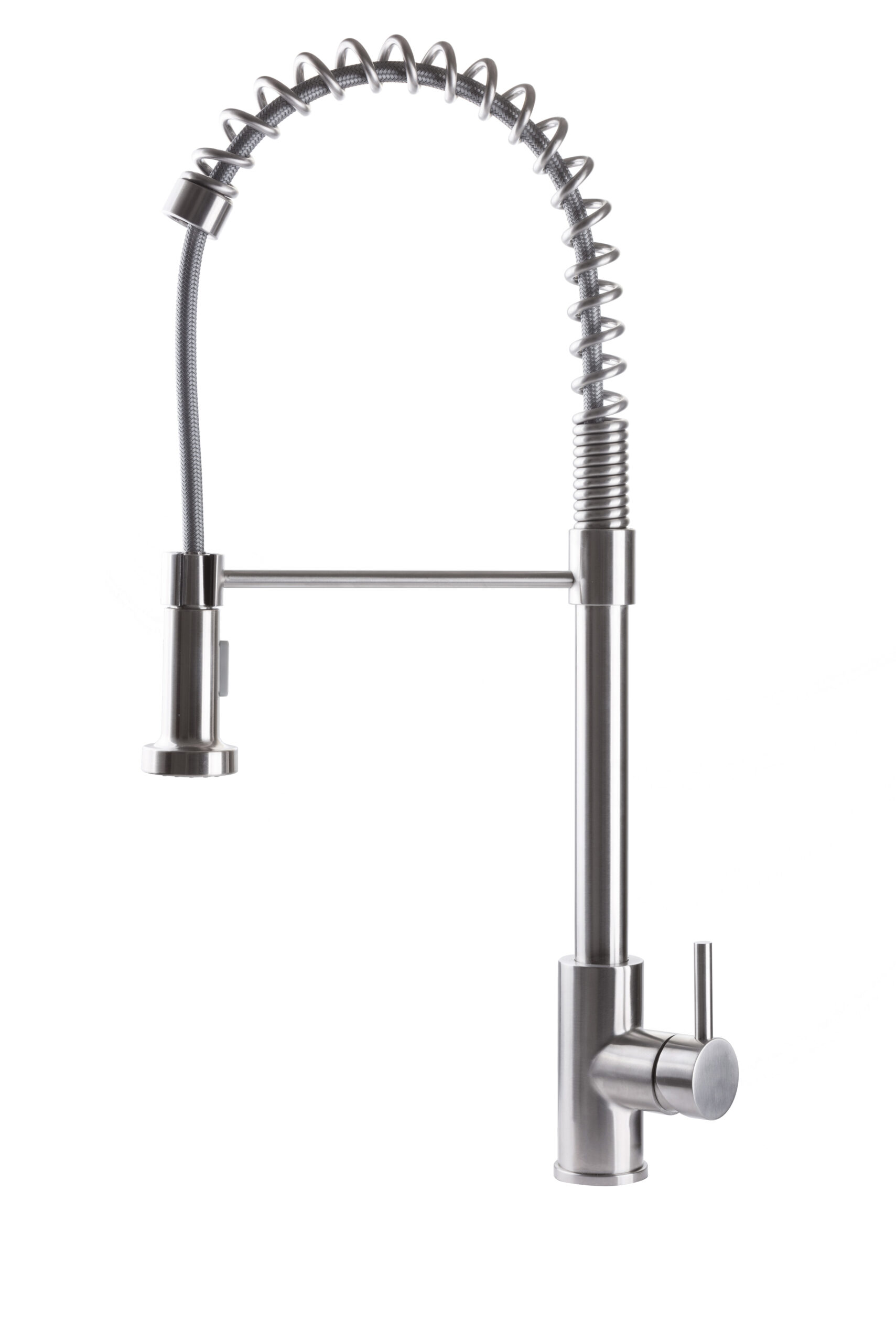 “Miscelatore monocomando in acciaio inox per lavello, con molla girevole e orientabile, dotato di erogazione a doppio getto e flessibili di alimentazione F3/8””